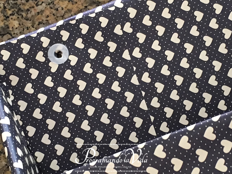 Paso 12: Cuando termine de forrar el Porta Papeles de Cartón Reciclado, utilice un abre bocado (perforador de papel) y abrí dos huecos los cuales protegí con unas etiquetas especiales (ver foto).