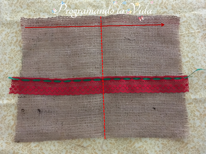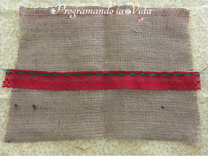 Paso 1: Luego de cortar el yute o la tela que escogiste lo primero que hice fue introducir la cinta en el encaje y luego cocerlo al yute.