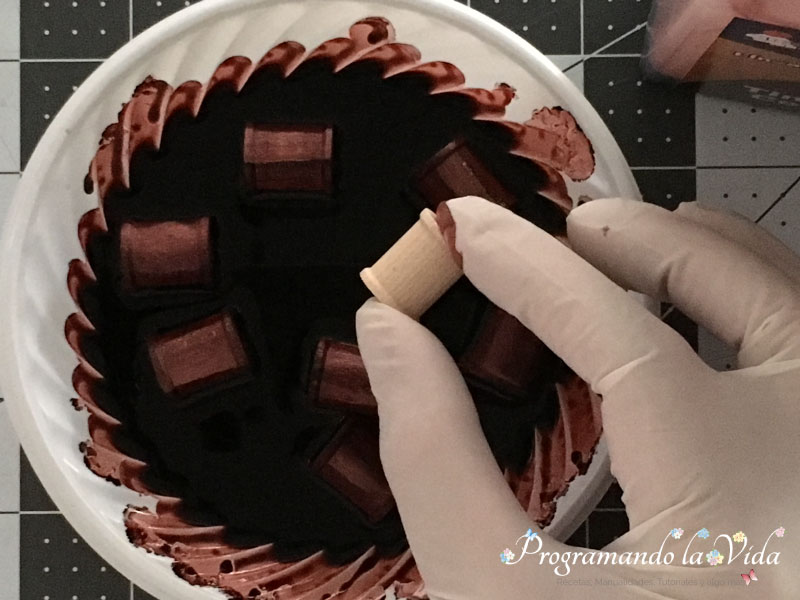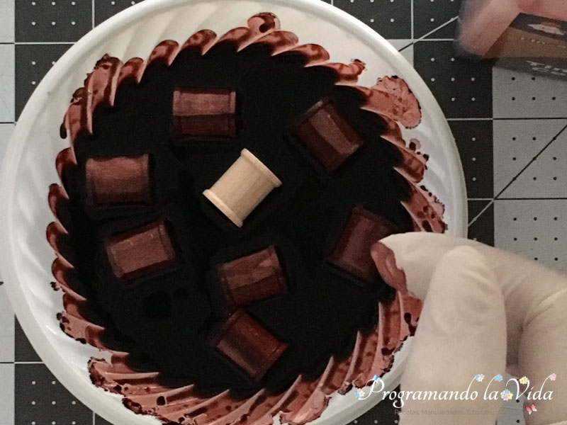 Paso 2a: En un plato de platico desechable coloqué todos los adornos y luego los cubrí con tinte para madera. Los dejé hasta que absorbieran todo el tinte.