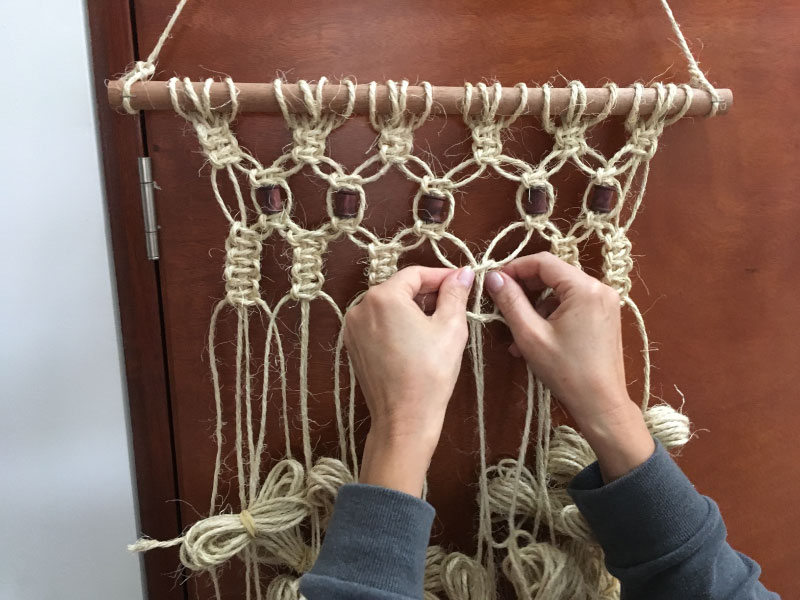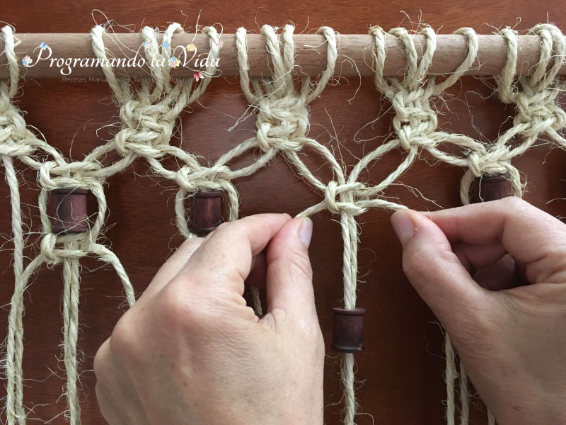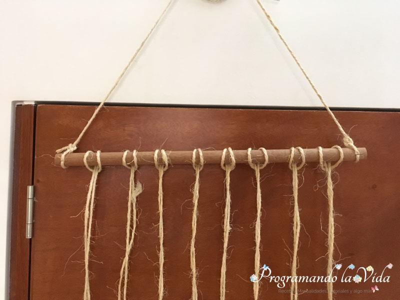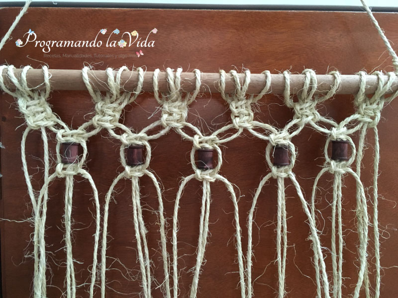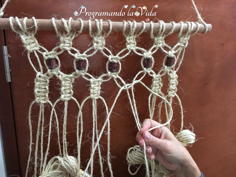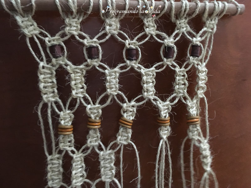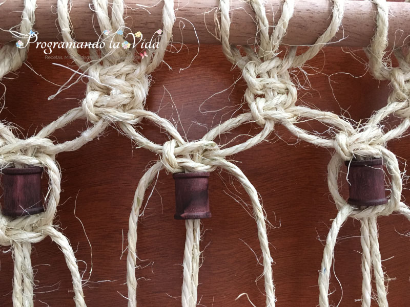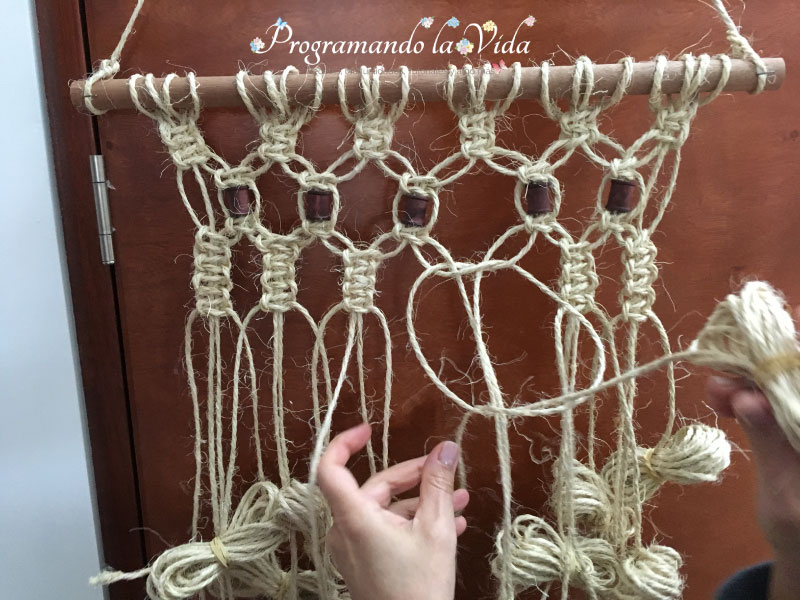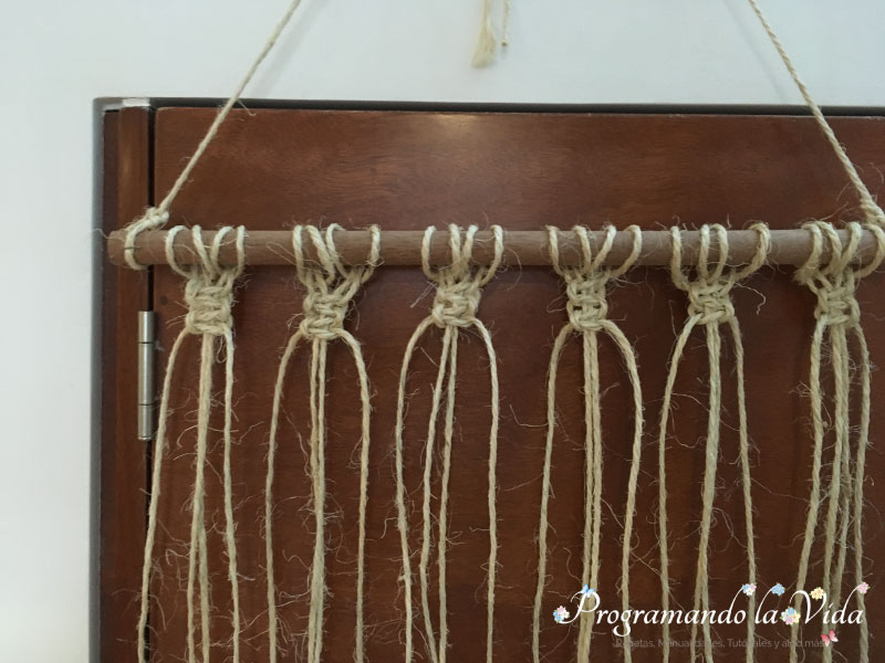 Paso 4: Comenzamos tejiendo do puntos planos con cada cuatro cuerdas. Quedando el Porta Matero de Pared en Macramé como se ve en la siguiente foto.